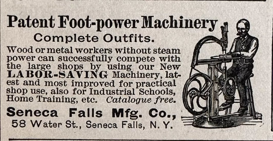 1896 Seneca Falls Patent Foot Power Machinery Illustrated Antique Print Ad